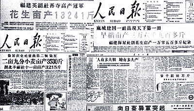 1958年6月8日,《人民日报》报道河南省遂平县卫星农业社5亩小麦平均亩产达到2105斤,四天后,该报又报道2.9亩小麦田亩产3530斤。两天后,《新华社》加入行列,报道湖北省一个试验田小麦亩产4353斤;一周后,《人民日报》出现了4689斤的报道。