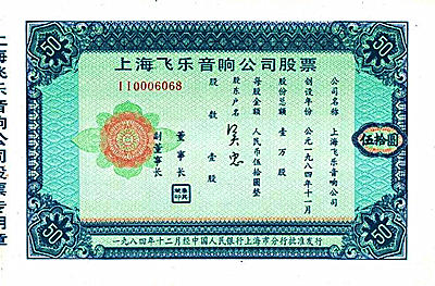 上海飞乐由上海电声总厂发起成立,经营成套设备并承包音响设施的设计与安装。该公司委托中国工商银行公开向社会发行股票一万股,每股50元。这是文革结束以来中国金融机构第一次发行的股票。