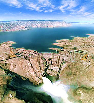 位于整条5000公里黄河上游三分之一处的《龙羊峡水坝》水电发电站,于1989年6月15日全部竣工,装机总容量为128万千瓦,主要供电西宁、兰州、西安等工业城市。